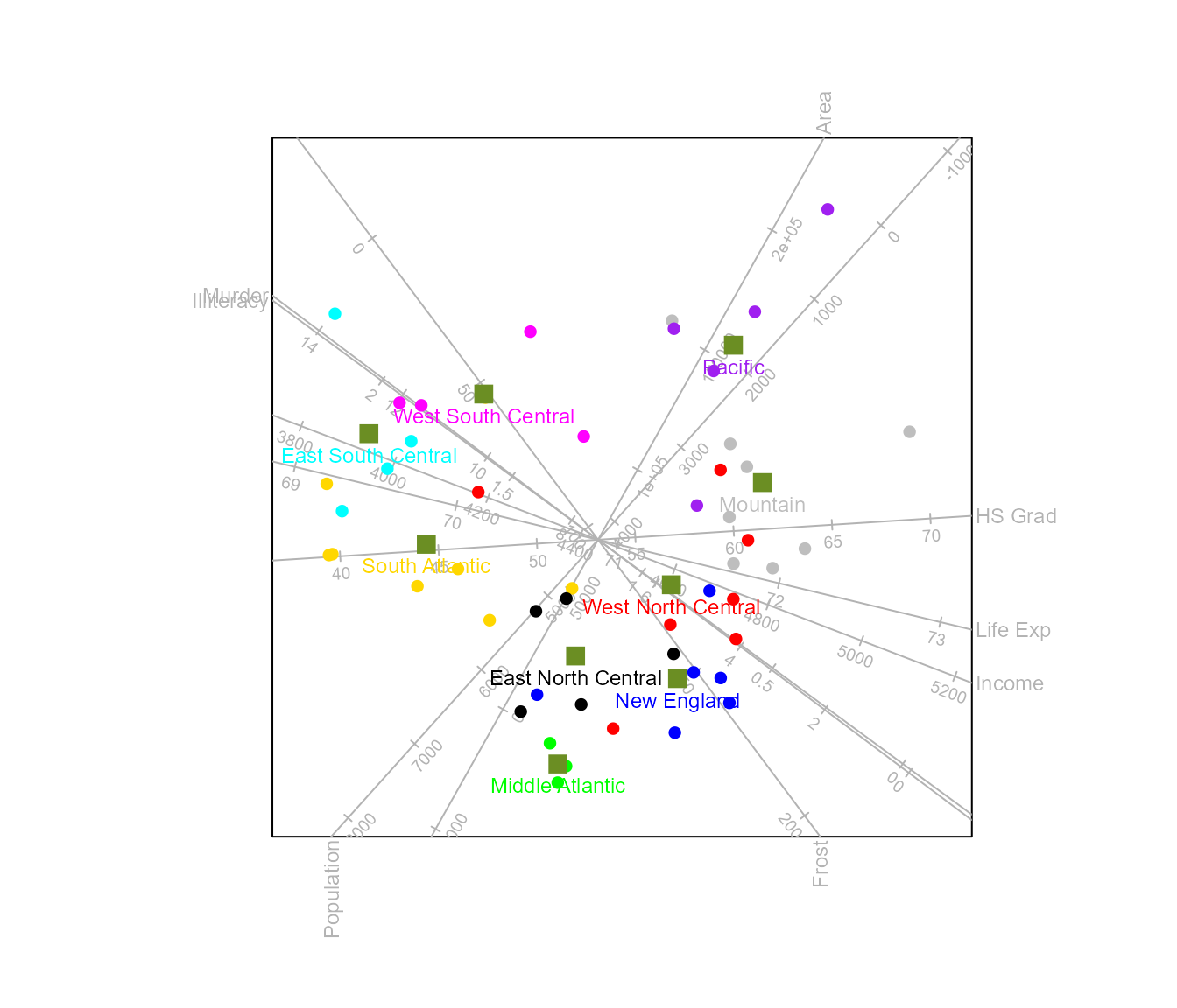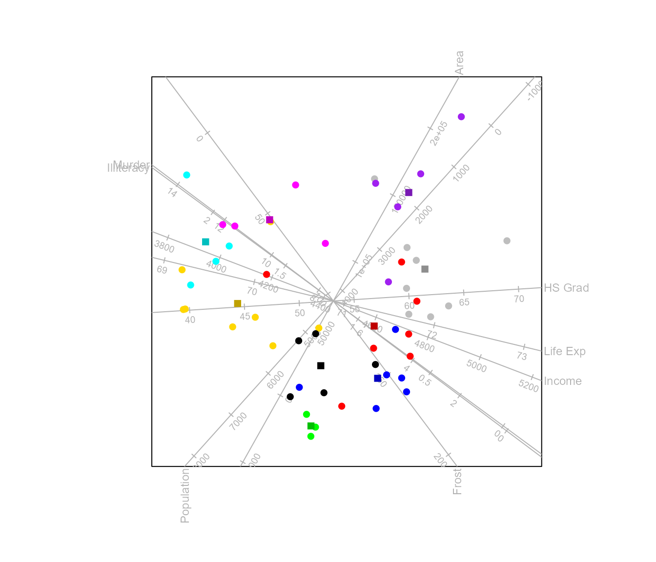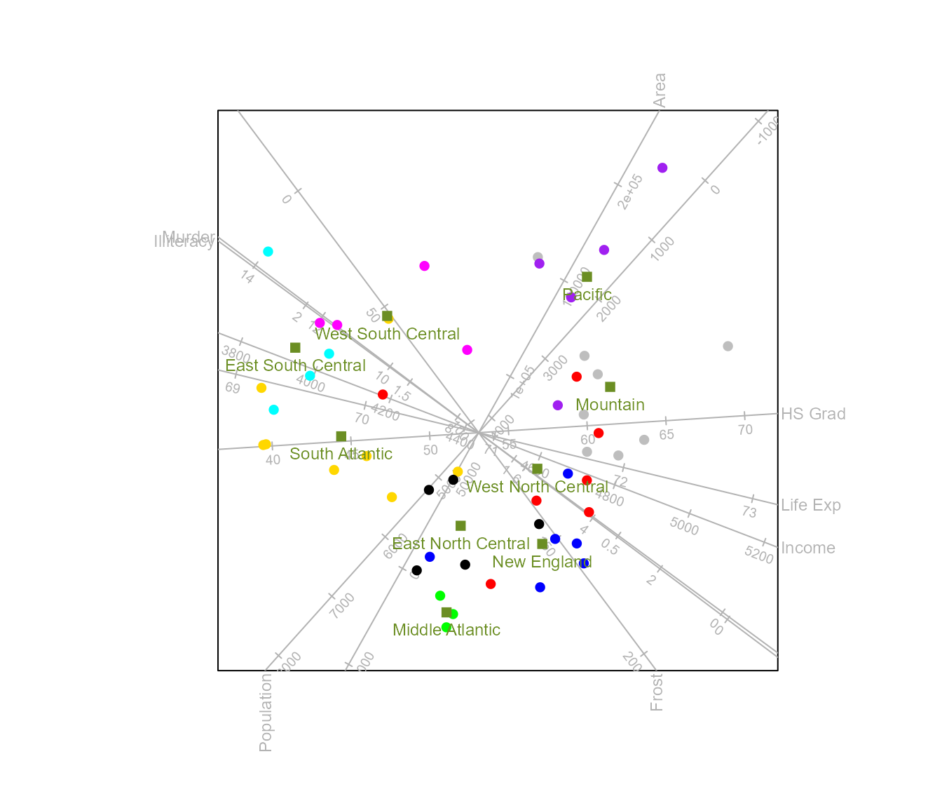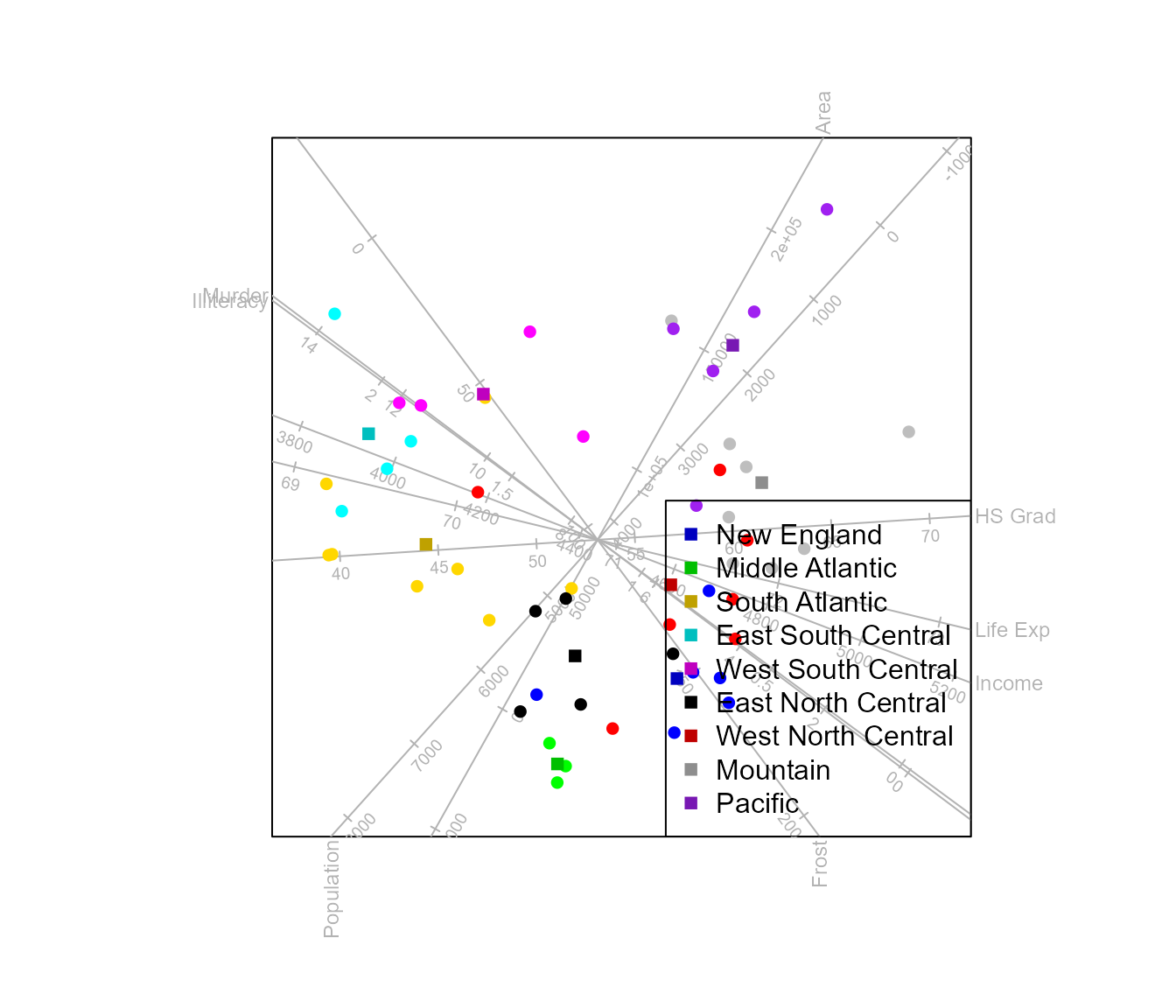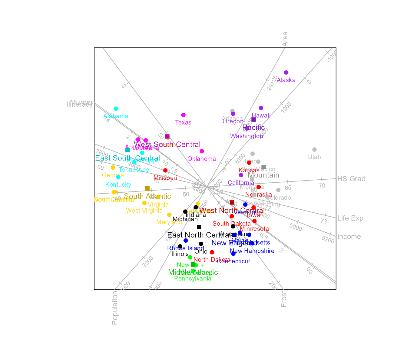 biplot(state.x77, scaled = TRUE) |>