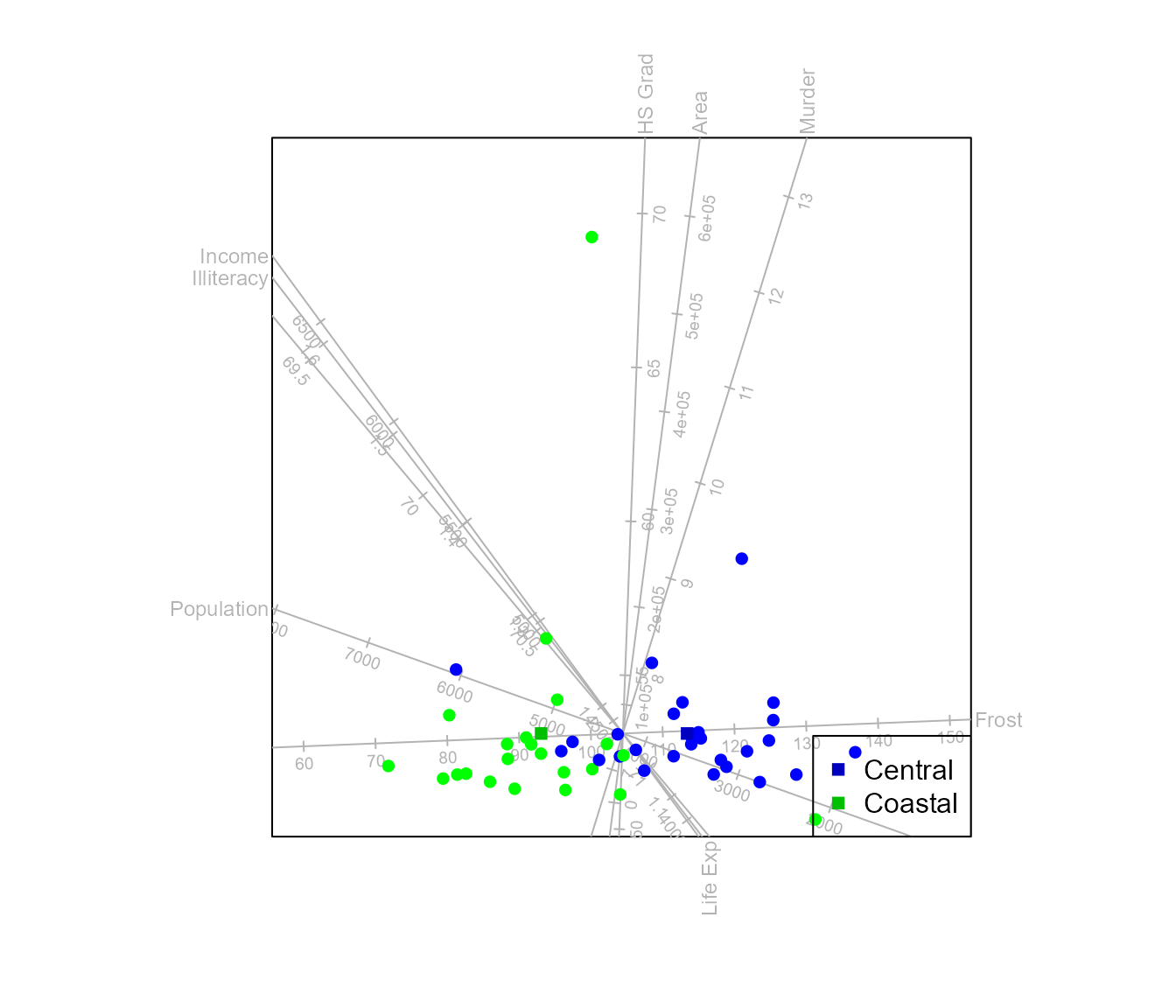biplot (state.x77) |> CVA (state.2group) |> legend.type(means=TRUE) |> plot()