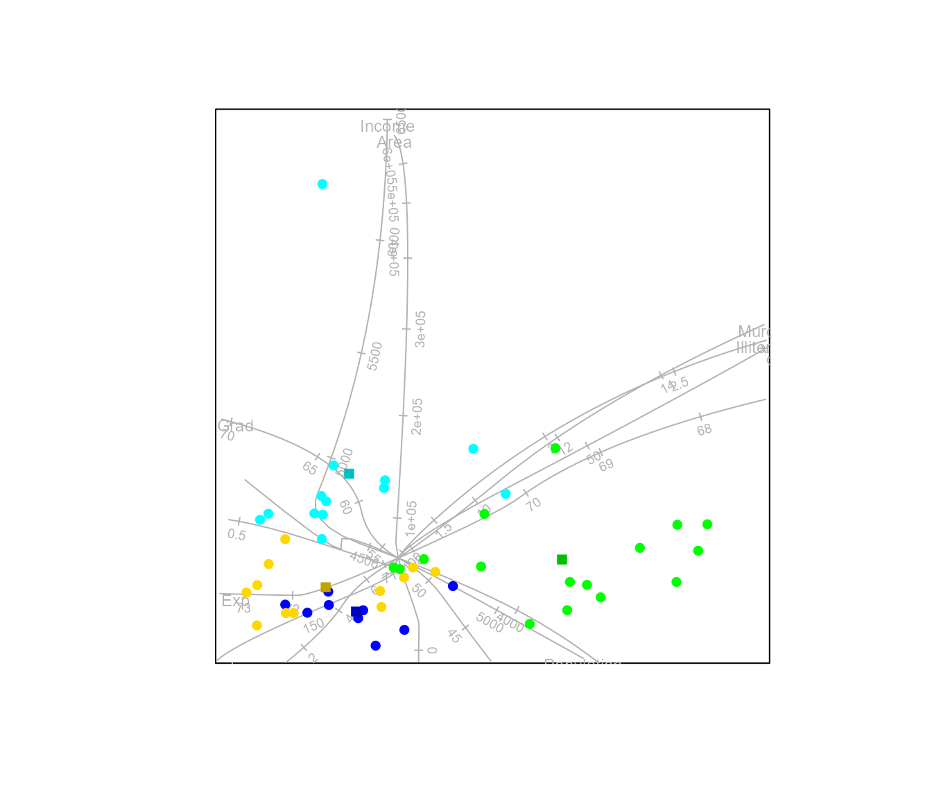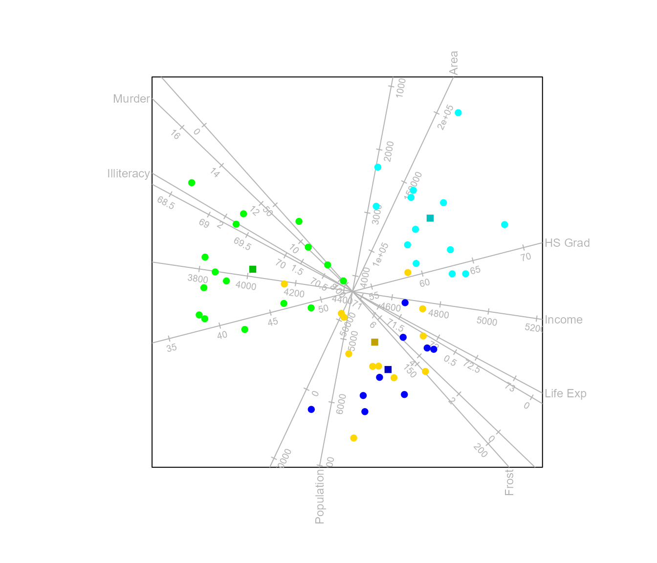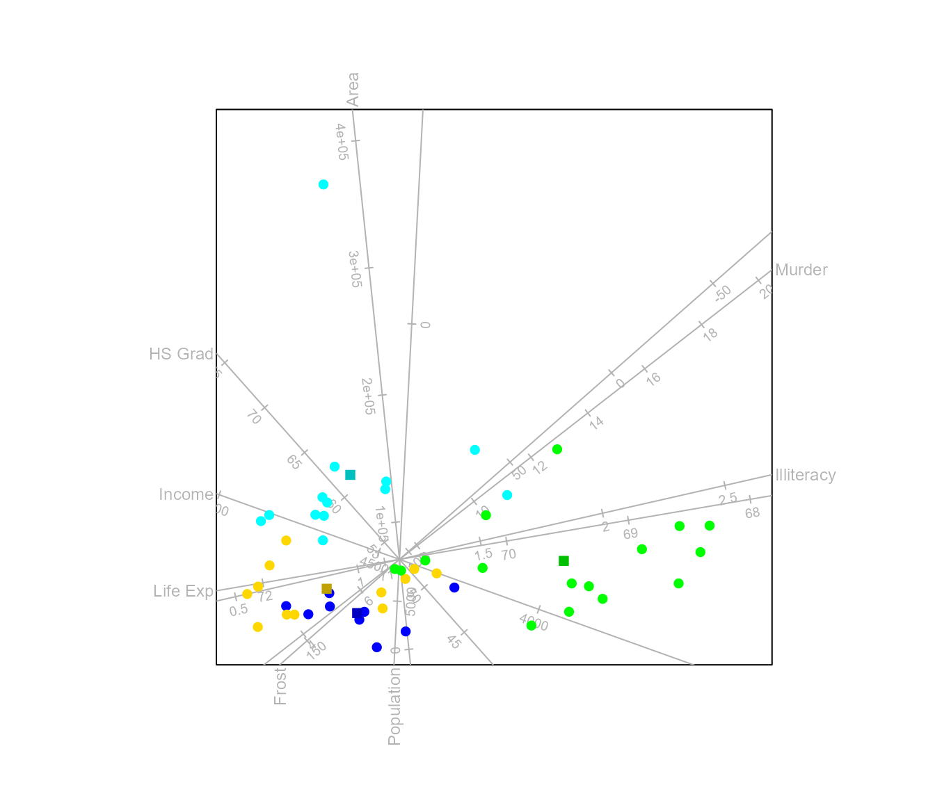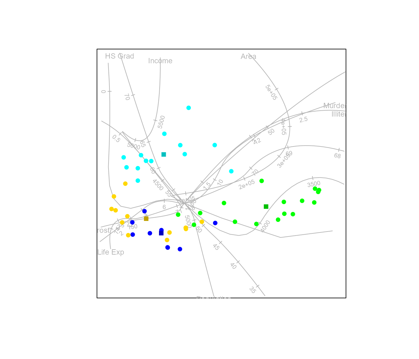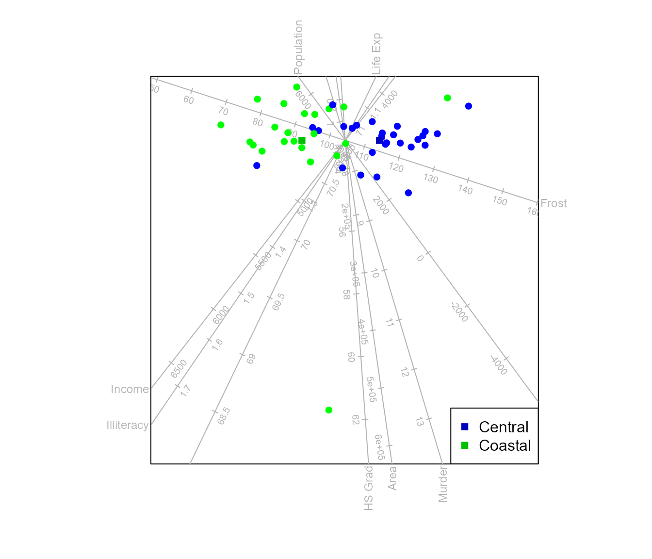 #> Warning in CVA.biplot(biplot(state.x77), state.2group): The dimension of the