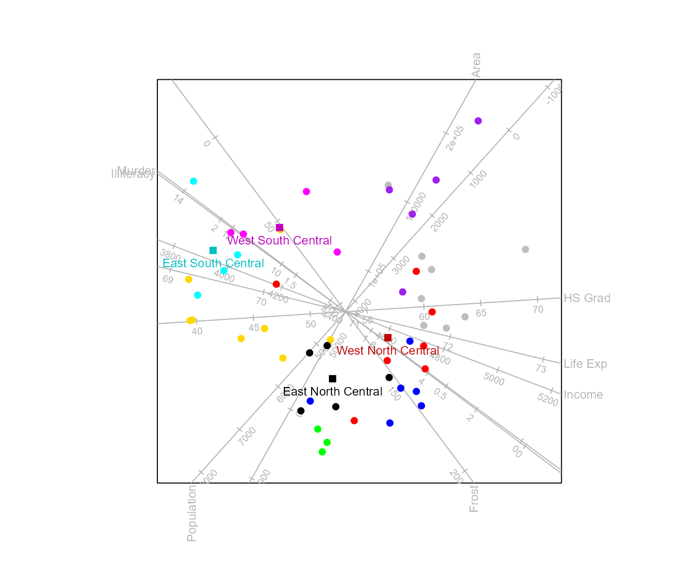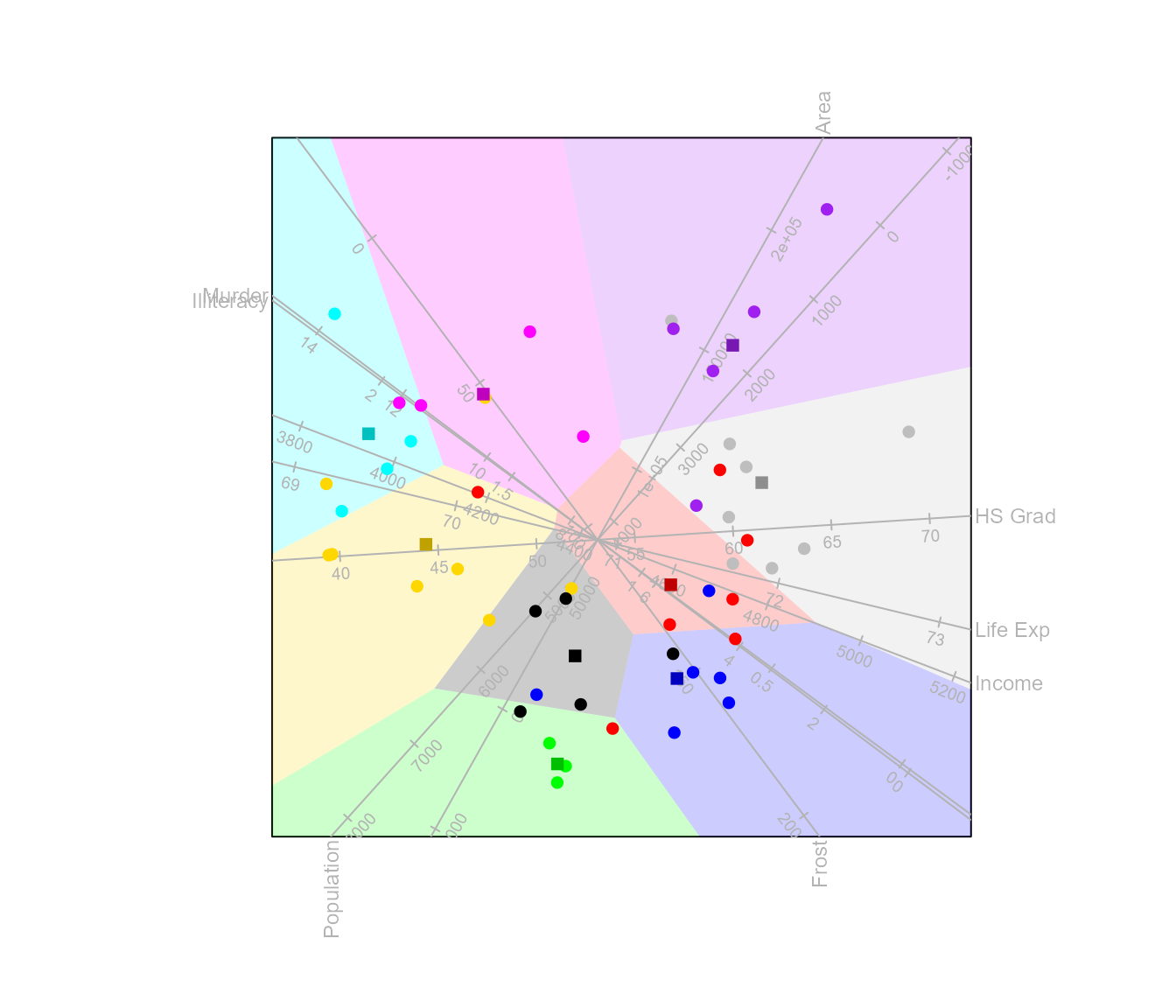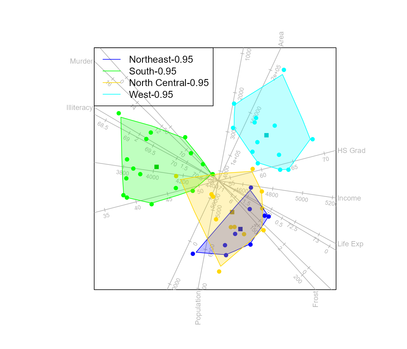 biplot(state.x77) |> CVA(classes = state.region) |> alpha.bags() |>