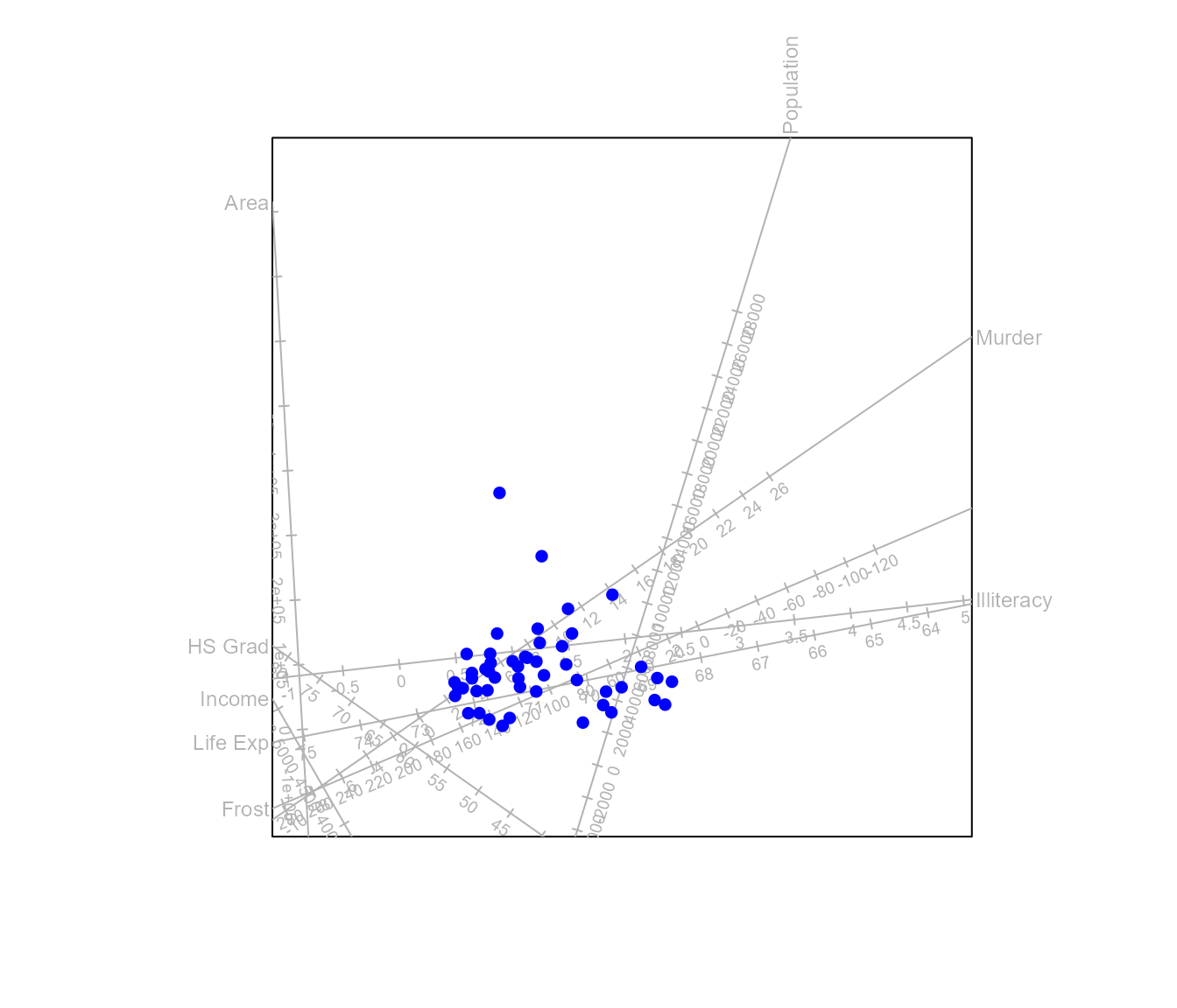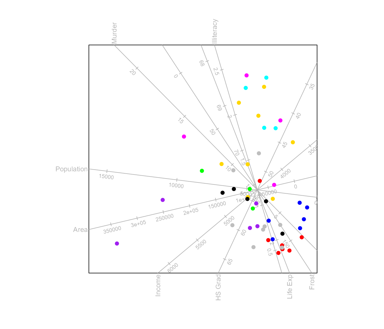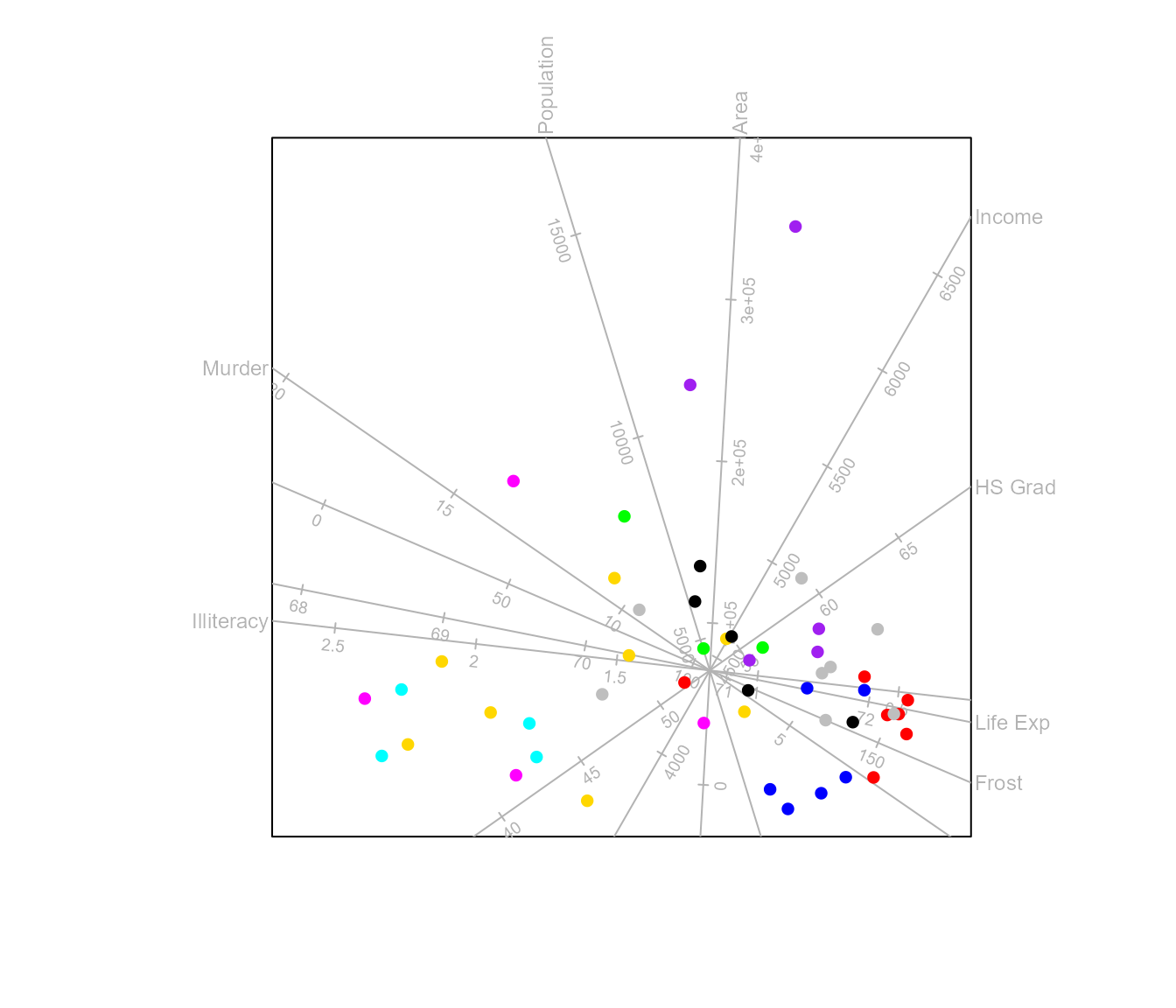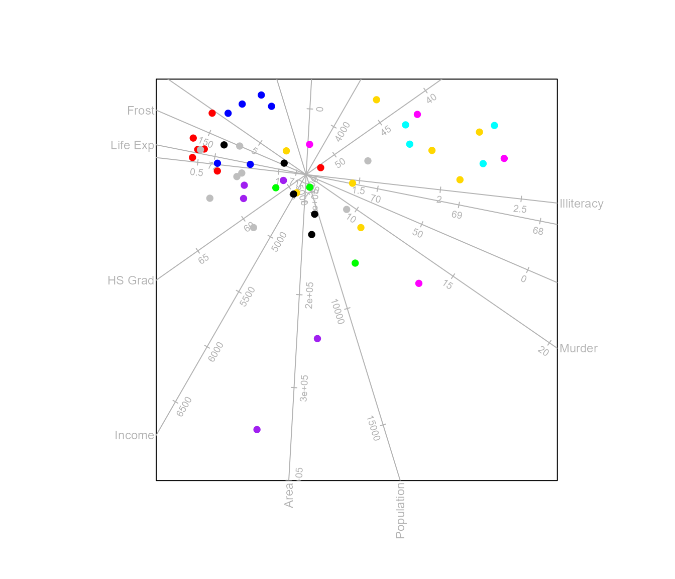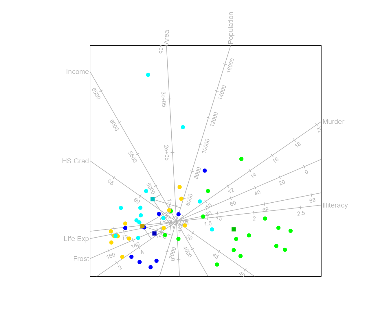 out <- biplot(state.x77, scale = TRUE) |> PCA(group.aes = state.region, show.class.means = TRUE) |>