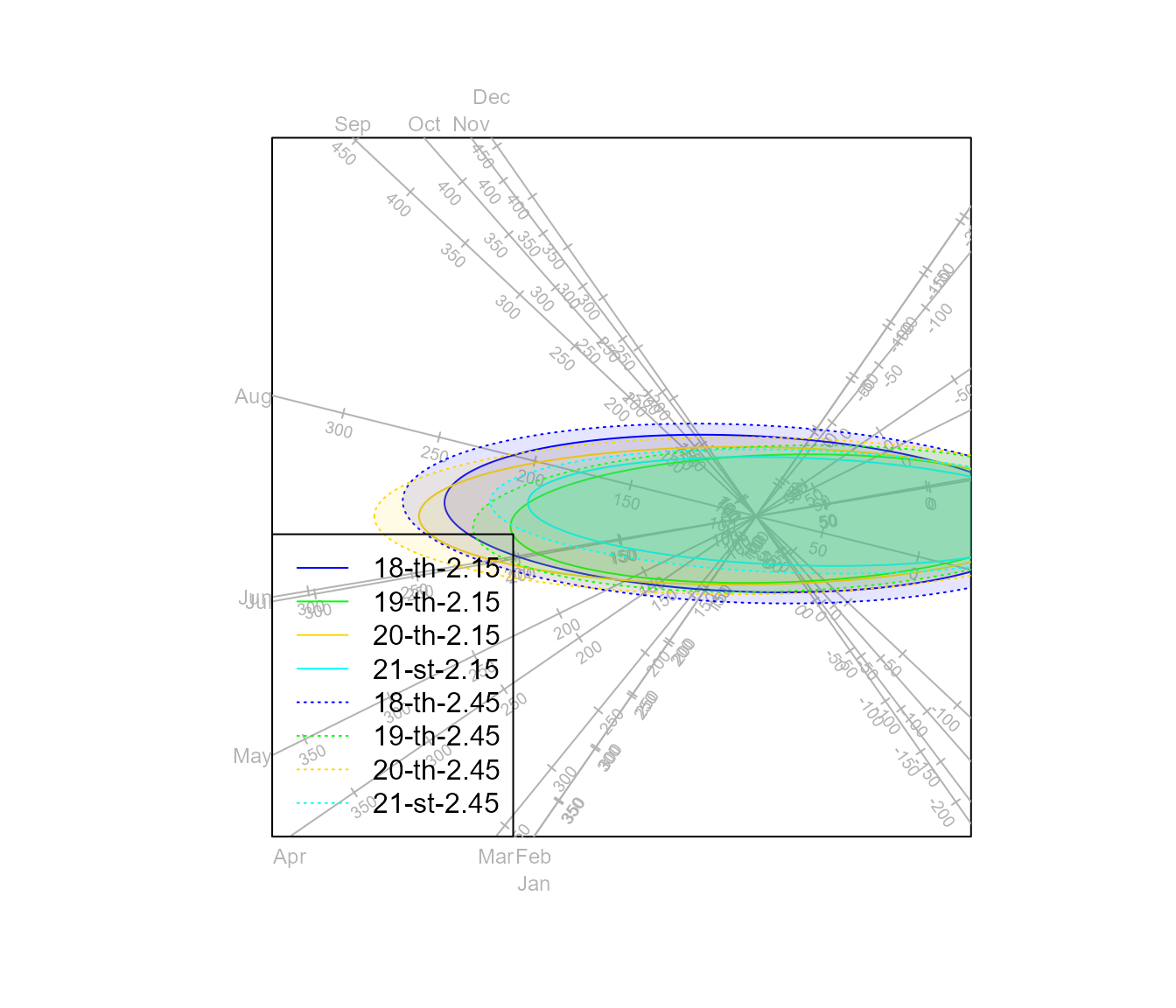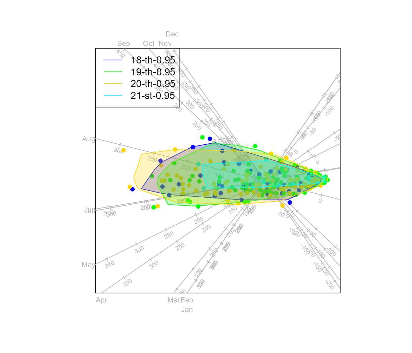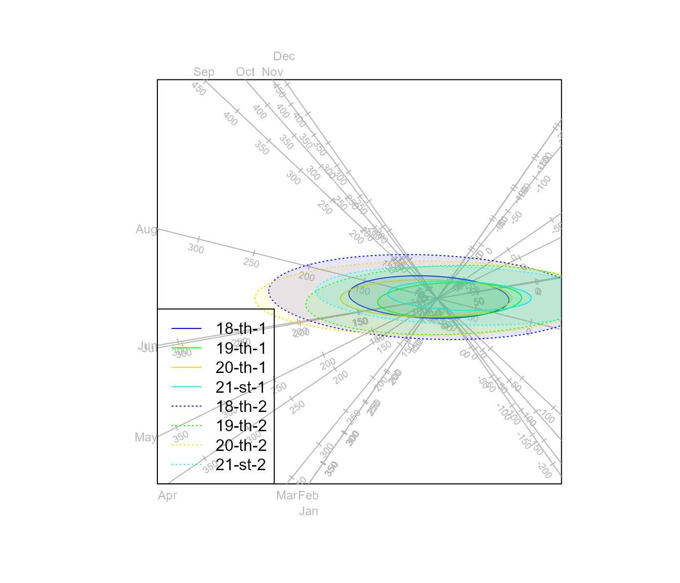 biplot(sunspots, group.aes=century) |> PCA() |>