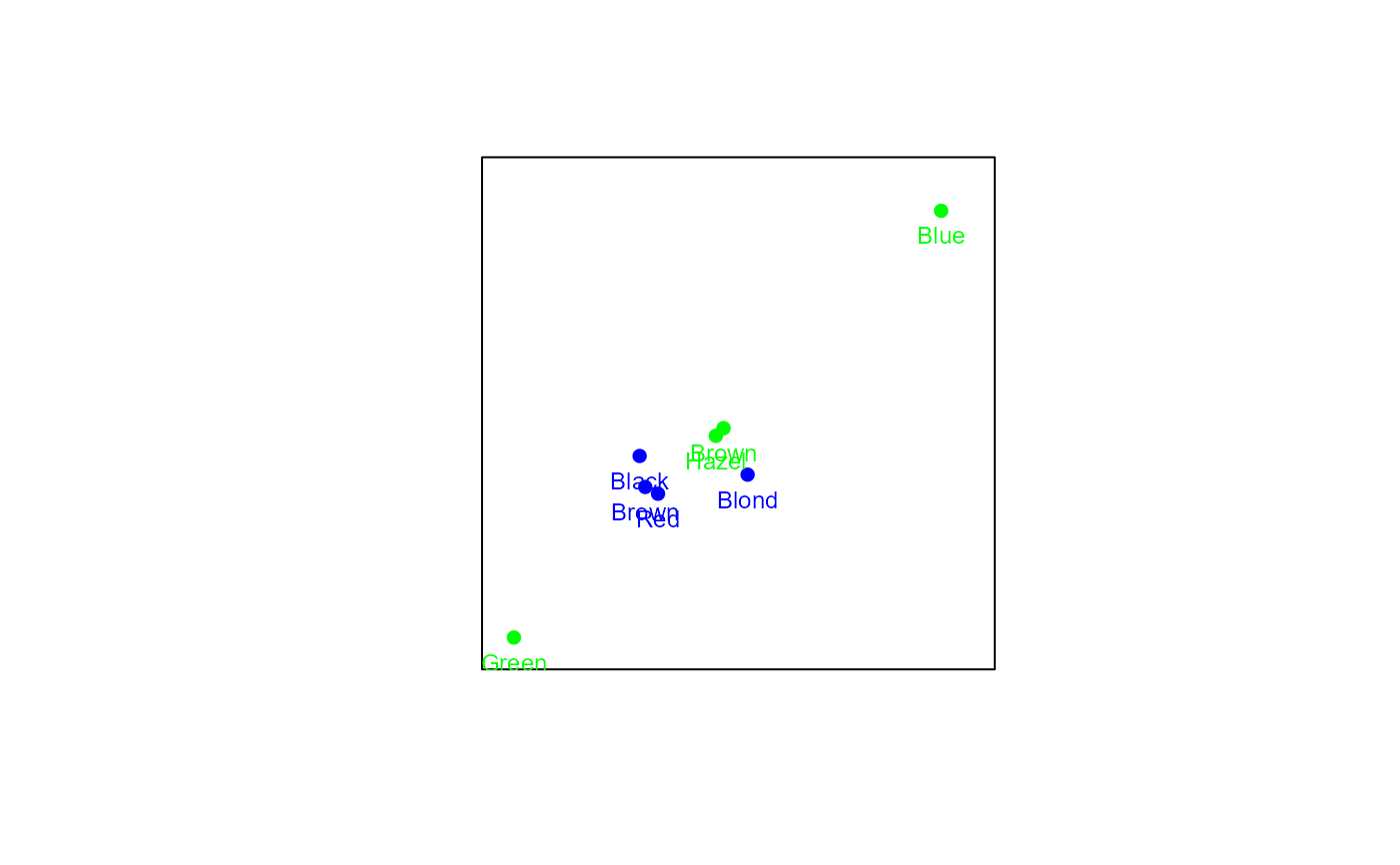 variant = "Stand", presents a biplot with rows in standard coordinates and columns in principal coordinates.variant = "symmetric", presents a symmetric biplot with row and column standard coordinates scaled equally by the singular values.- lambda.scal