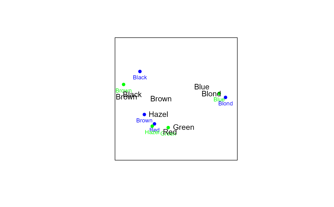 The object of class biplot will be appended with the following elements: