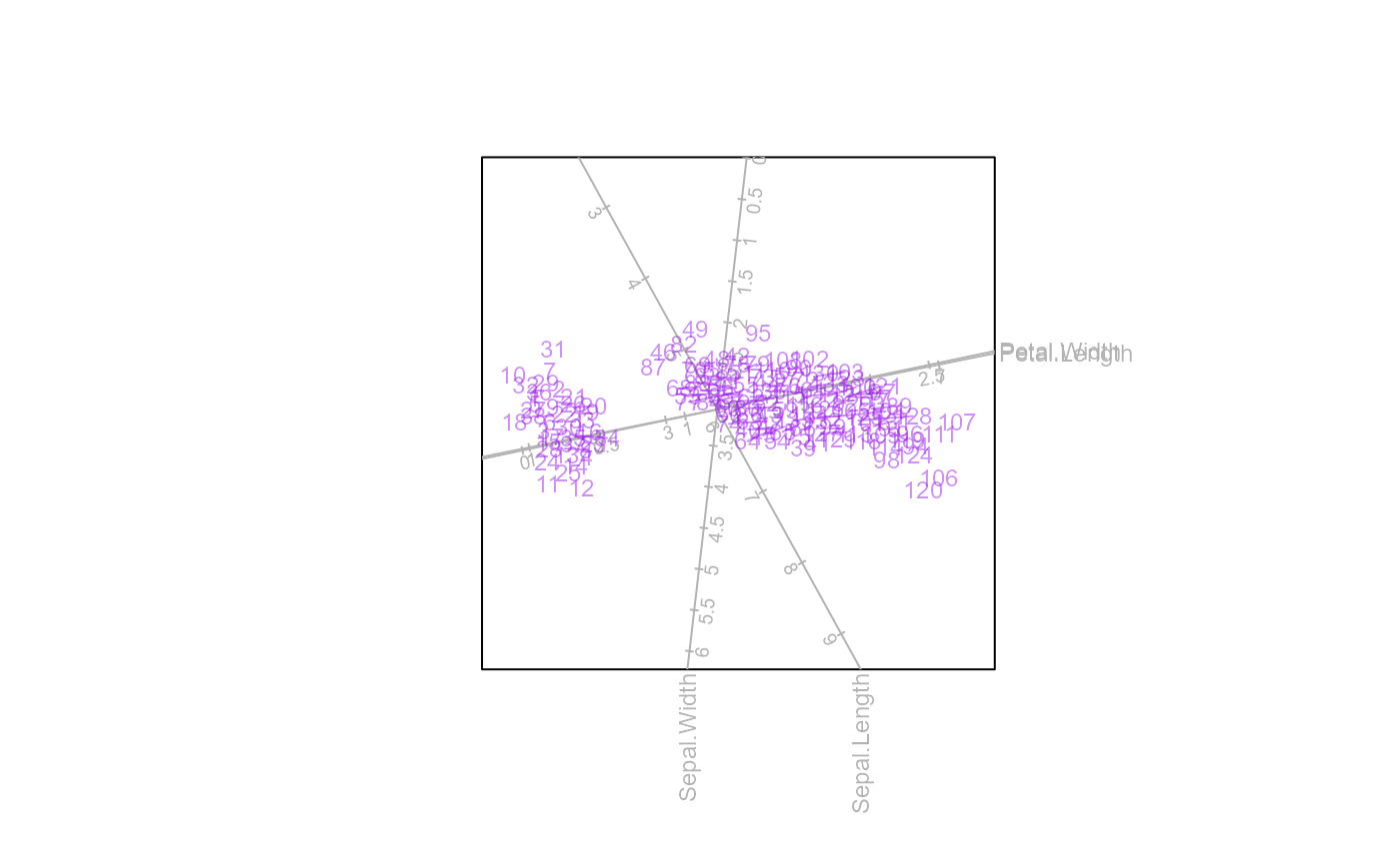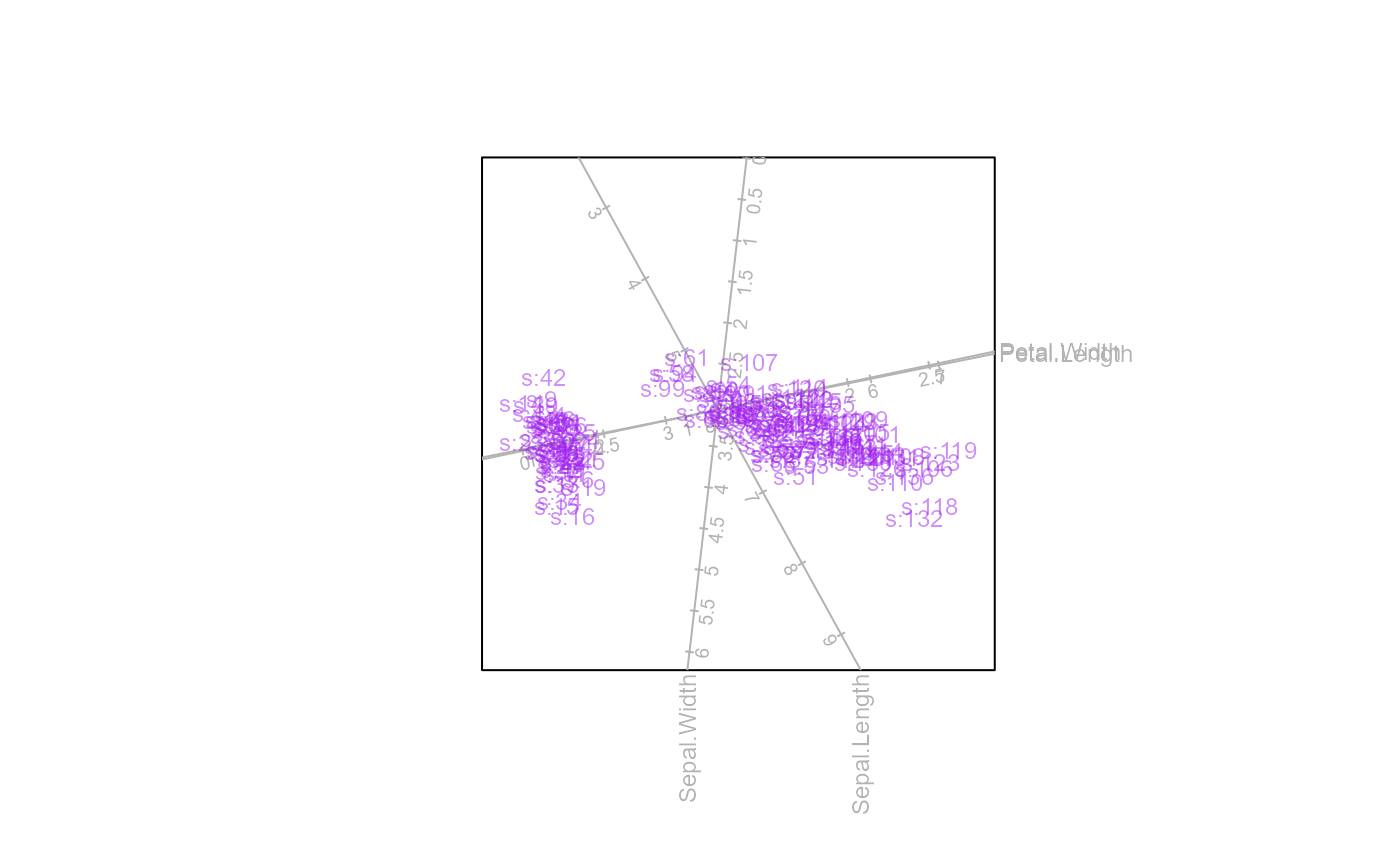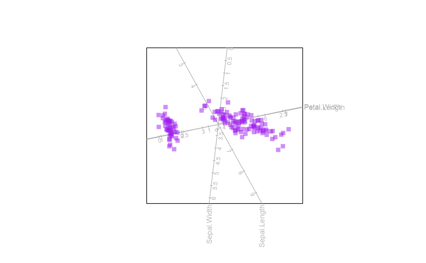 biplot(iris[,1:4]) |> PCA() |> samples(col="purple",pch=15, opacity=0.5) |> plot()
